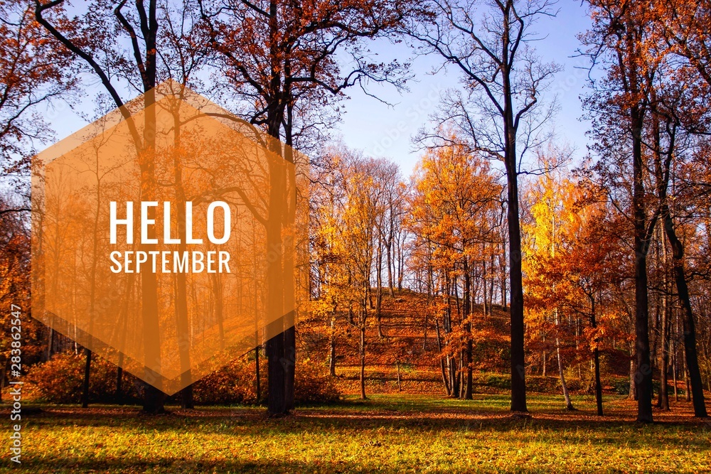 Hello September banner. New month. Greeting card. Golden autumn. The text in the photo. Trees in the park. City Park. Autumn Park
