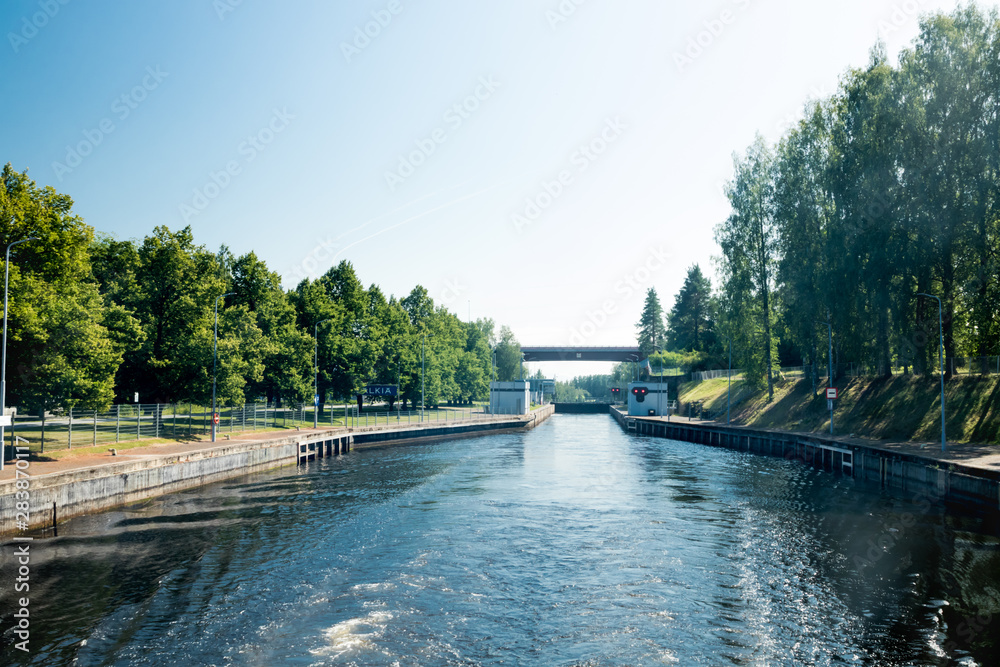 Lappeenranta, Finland - August 7, 2019: Lock on the Saimaa Canal at Malkia. View from water.
