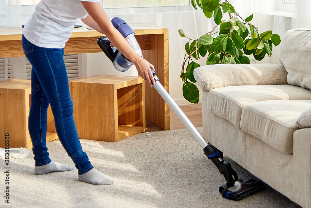 Portrait of young woman in white shirt and jeans cleaning carpet under sofa with vacuum cleaner in living room, copy space. Housework, cleaning and chores concept