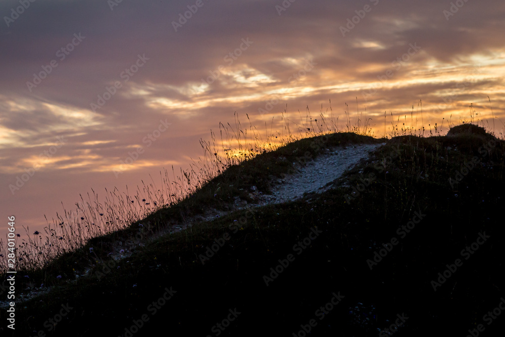 A chalk pathway on Ditchling Beacon in the South Downs, at sunrise
