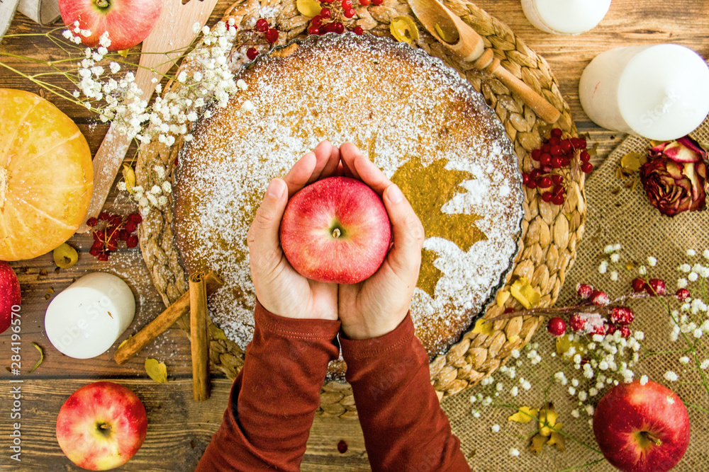 Apple in the hands of a top view. Female hands in a warm sweater hold a red apple in their hands over the table where is homemade pie, pumpkin, candles, cinnamon, flowers. Autumn background concept,
