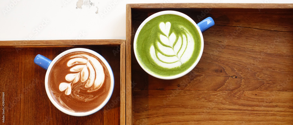 A cup of green tea matcha latte and cup of latte art coffee on wooden background