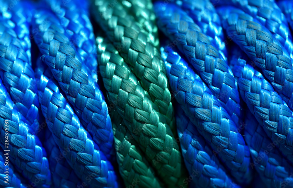 Close-up of a thick green and blue plastic rope with many fibers woven into each other