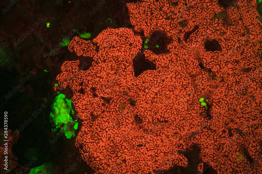 Natural occurring red fluorescing sponges (Leucetta sp.) and green hard coral (Acropora sp.). Night dive at Wetar Island, Banda Sea, Indonesia