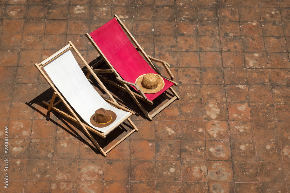 Dos hamacas, con un sombrero cada una, en un patio de una casa de campo, un día soleado