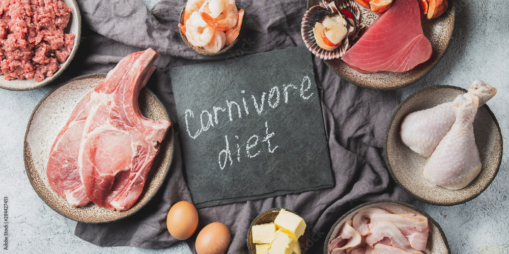 Selection food for CARNIVORE DIET. Seafood, Meat, megs and fat. Zero carbs diet concept