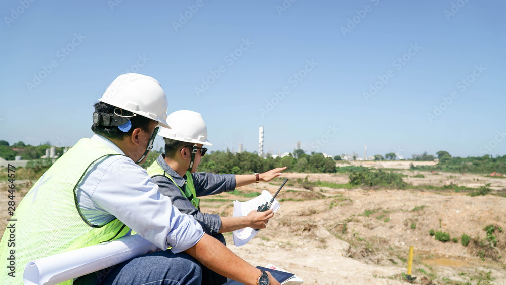 portrait of two engineer's or architect's dress with hardhat, safety helmet and safety vest have a meeting outdoors