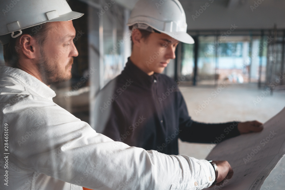 Builder worker and safety inspector wearing helment have meeting while look on construction blueprint. Two engineers building under constuction