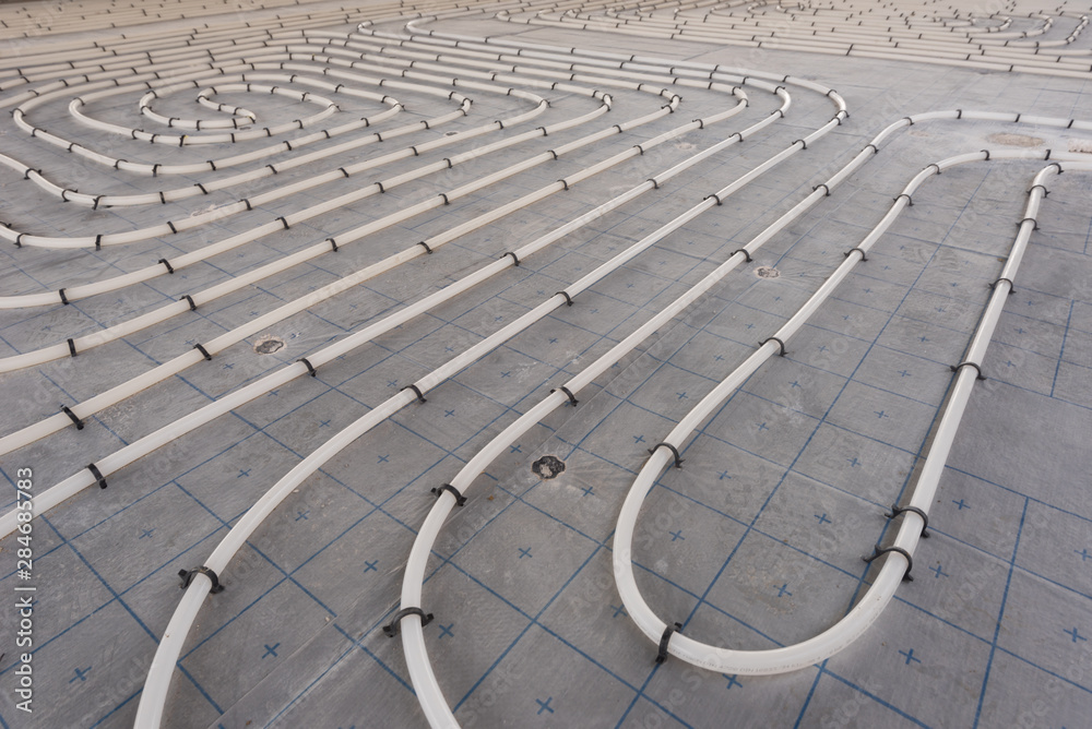 Underfloor heating system installation. Close up on water floor heating system interior of a new indoor swimming pool and SPA center. Plumbing pipes. Individual Heating.