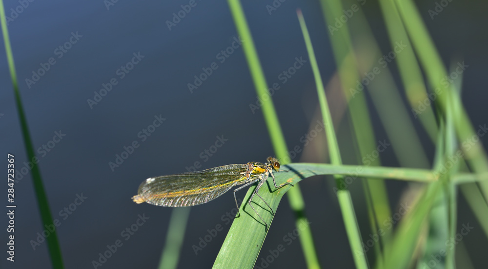 A dragonfly sits in a reed on a stalk