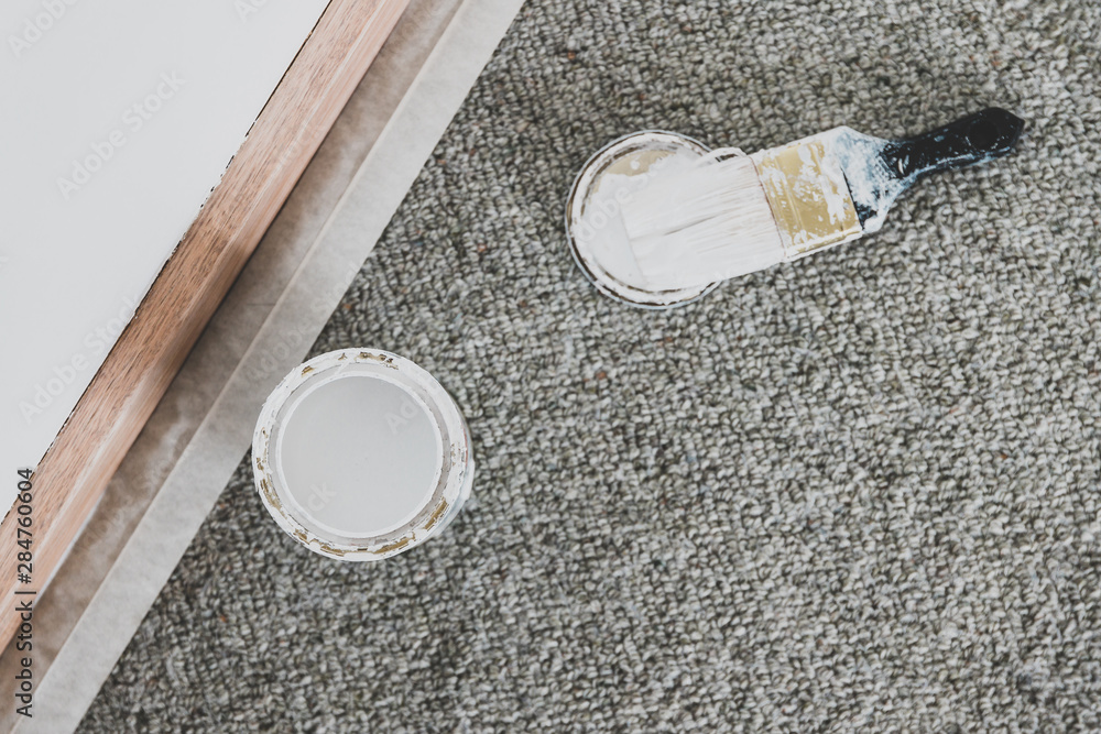 tin of white paint or primer with brush next to sanded wooden skirting boards