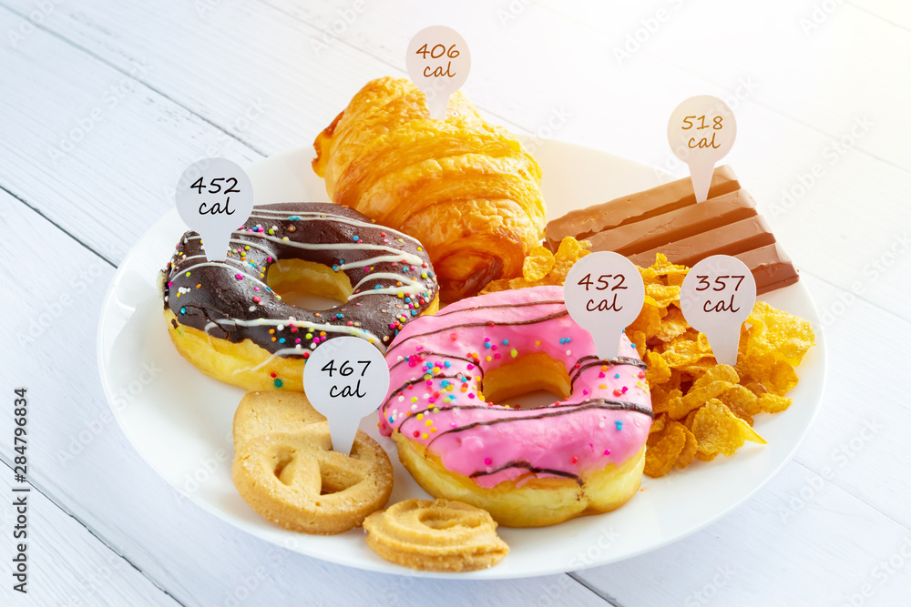 Calories counting and food control concept. doughnut ,croissant ,chocolate and cookies with label of quantity of calories for Calories measuring