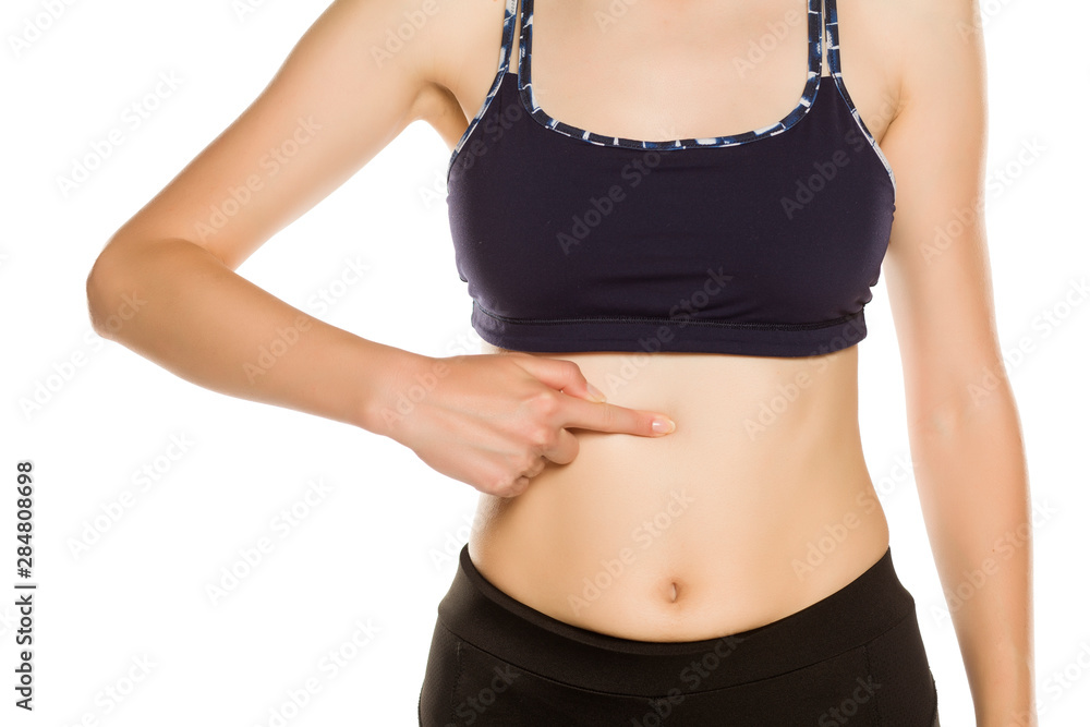 Young sporty woman pointing finger at her belly, tummy. Isolated on white background. Closeup.