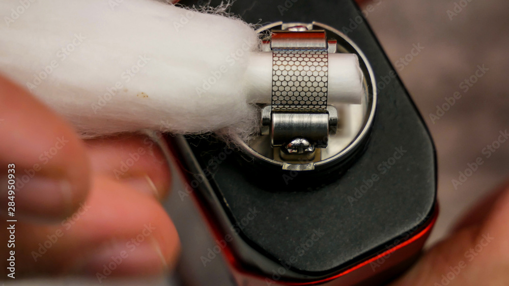 Preparation of mesh coil in the atomizer for vaping - Inserting the cotton under the coil.