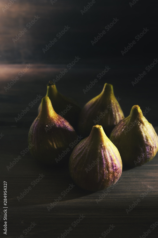 Group of organic figs on dark wooden background.