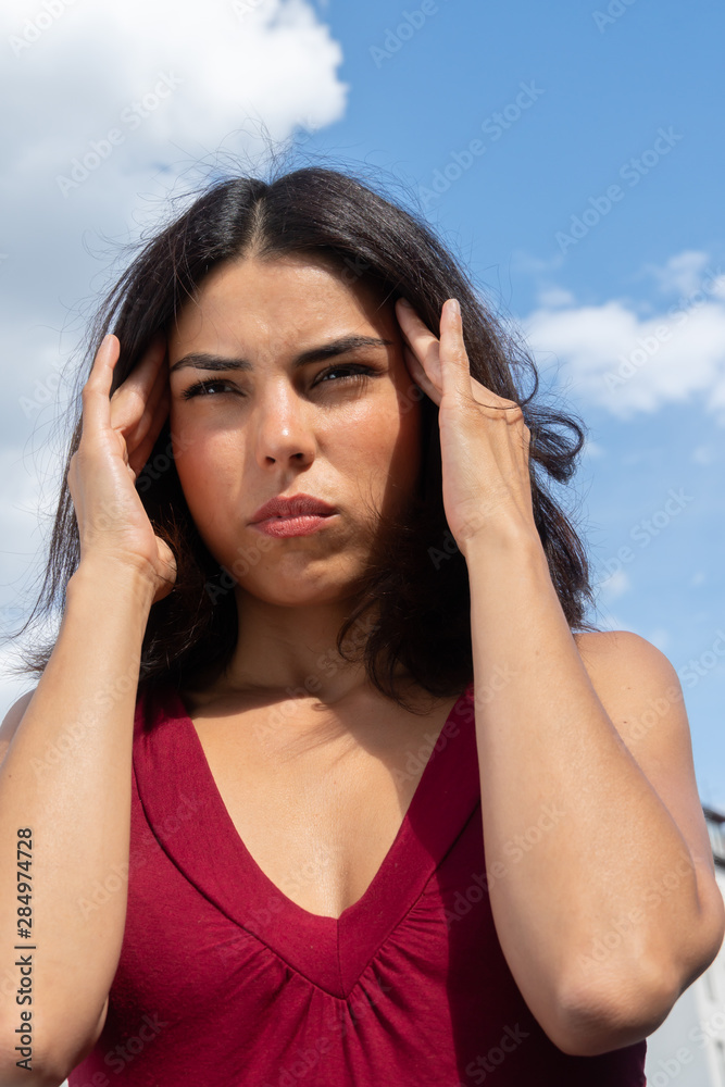Close up portrait of a brunette woman rubbing her temples to alleviate an awful headache. Outdoors