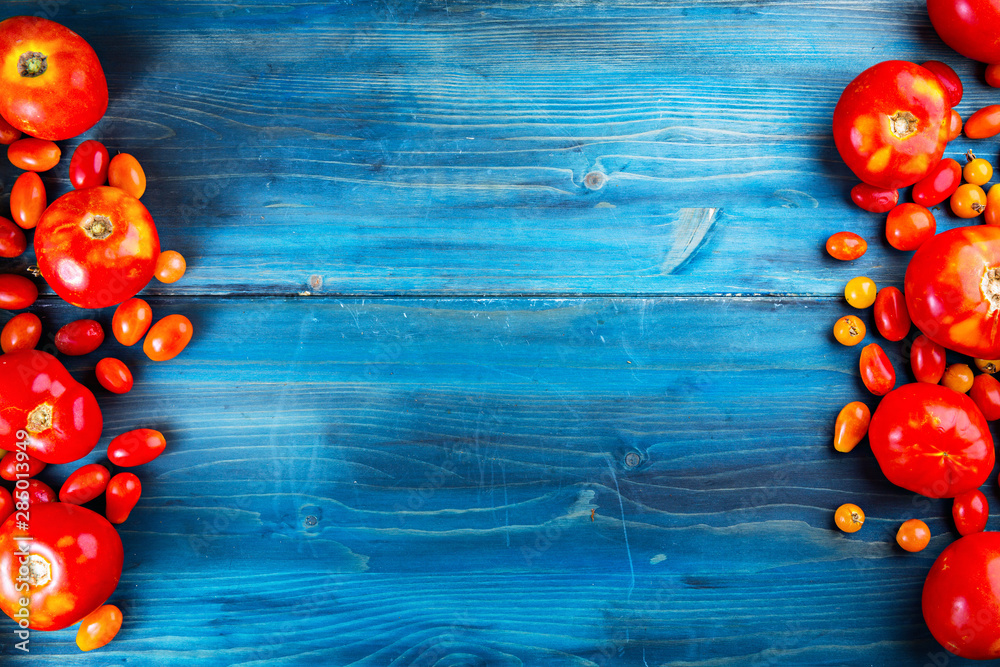 Organic tomatoes and cherry tomatoes on top of blue wooden background, with negative space in the middle. View from above.
