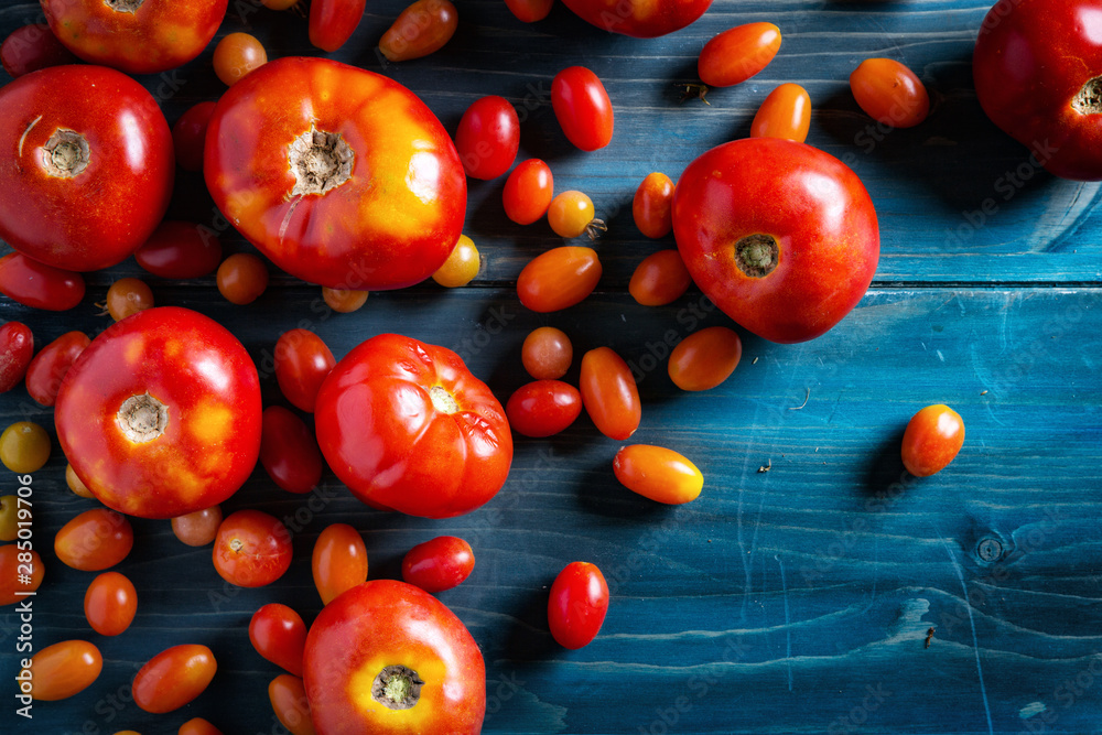 Top view of fresh organic tomatoes and cherry tomatoes, on top of dark blue wooden background.