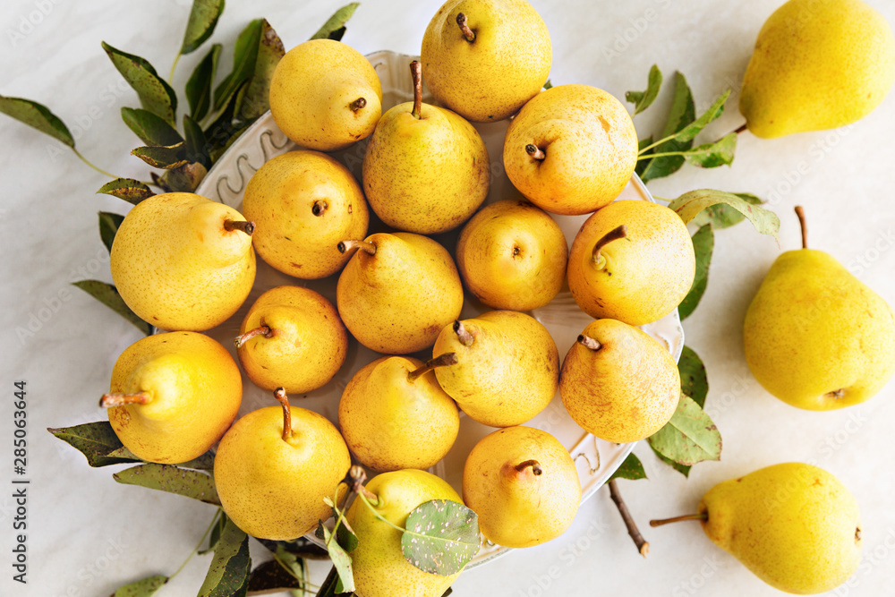 Top view of organic, yellow pears on top of kitchen table.