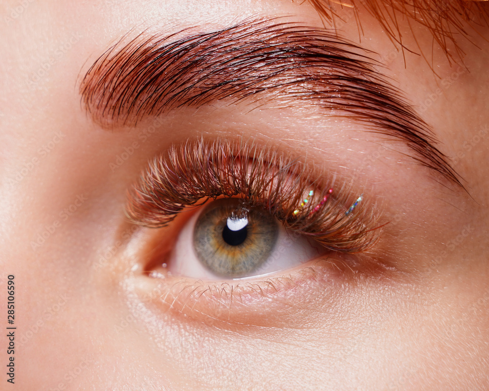 Beautiful macro photography of a woman's eye with extreme make-up of long eyelashes. Perfect long eyelashes. without cosmetics. Close-up fashion eye visage, lamination eyebrow beautiful