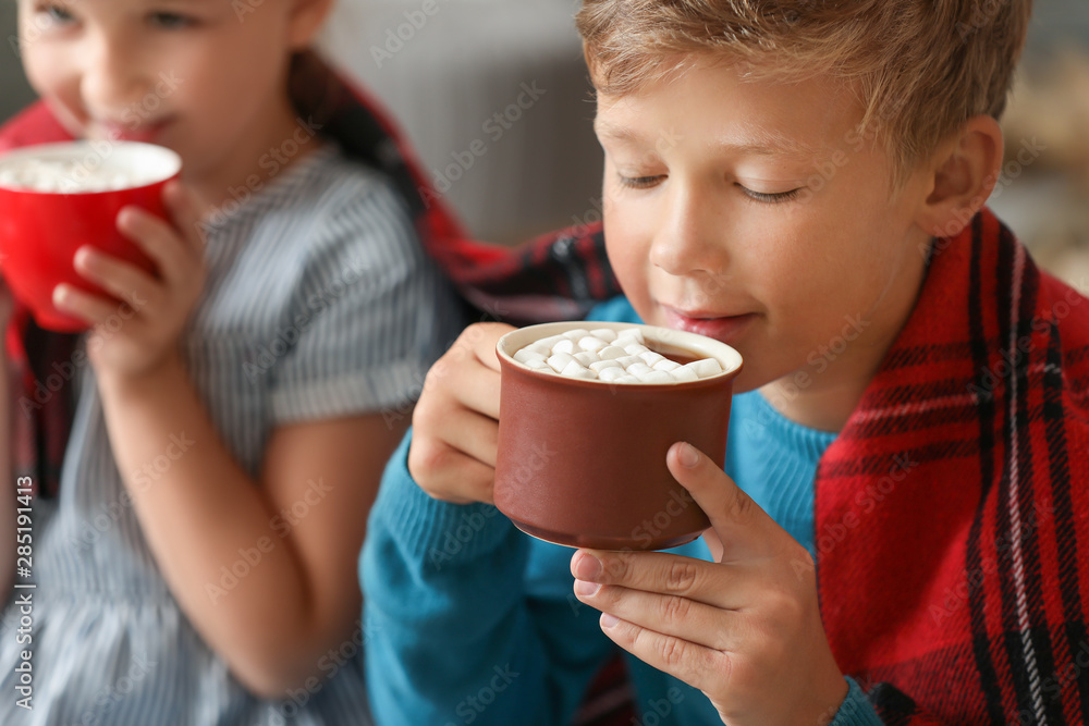 Cute little boy drinking hot chocolate at home on Christmas eve