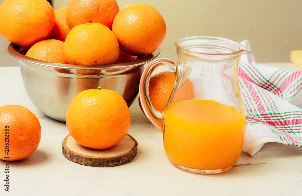 Fresh oranges with juicer pressed manual method on the wooden table.