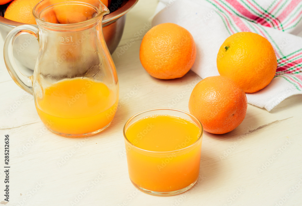 Fresh oranges with juicer pressed manual method on the wooden table.