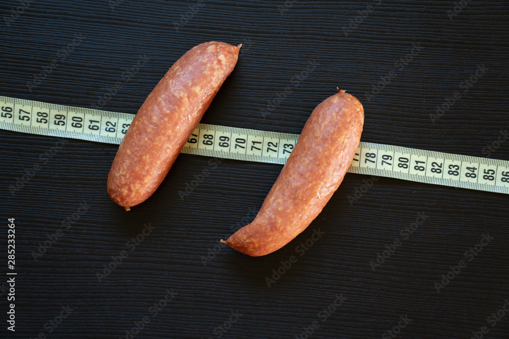 Diet concept - pork sausages wrapped with yellow measuring tape