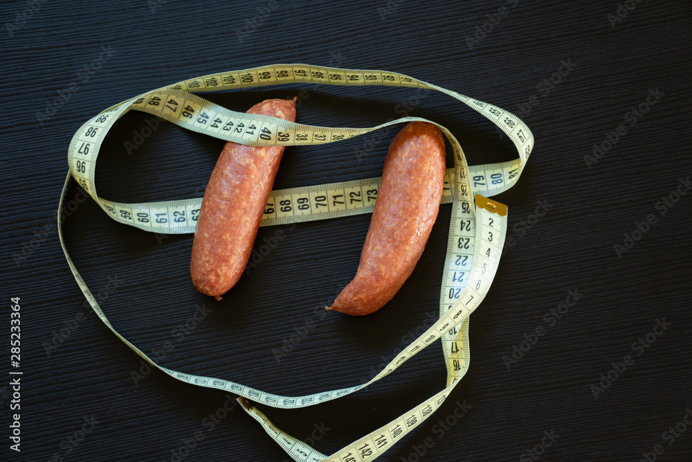 Diet concept - pork sausages wrapped with yellow measuring tape