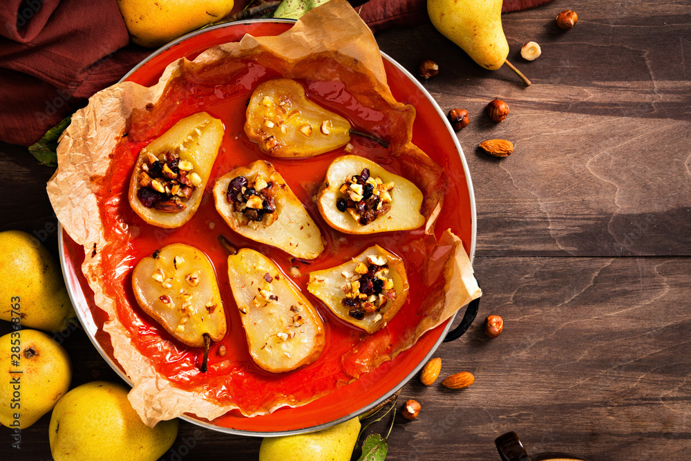 Top view of baked pears with mixed nuts and honey, with negative space available.
