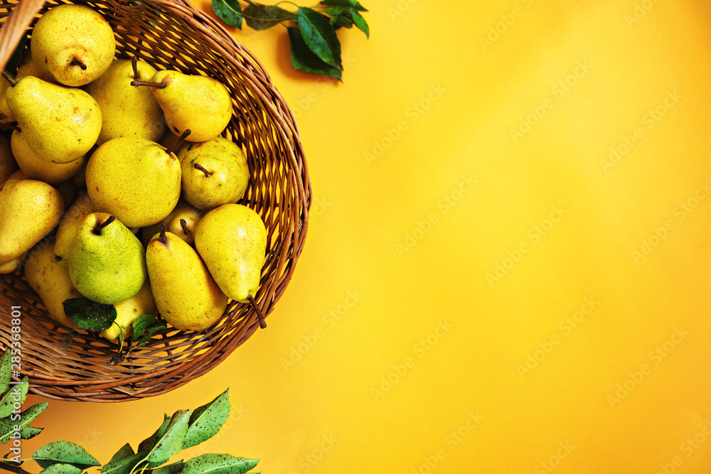 Wooden basket, full of organic pears against yellow background, with negative space next to it.