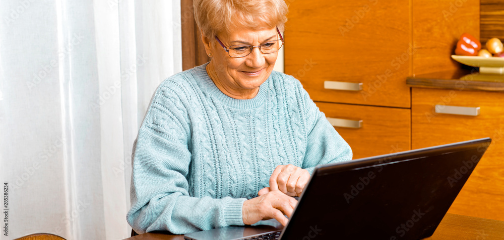 Smiling senior woman, grandmother sitting in home and working on laptop.