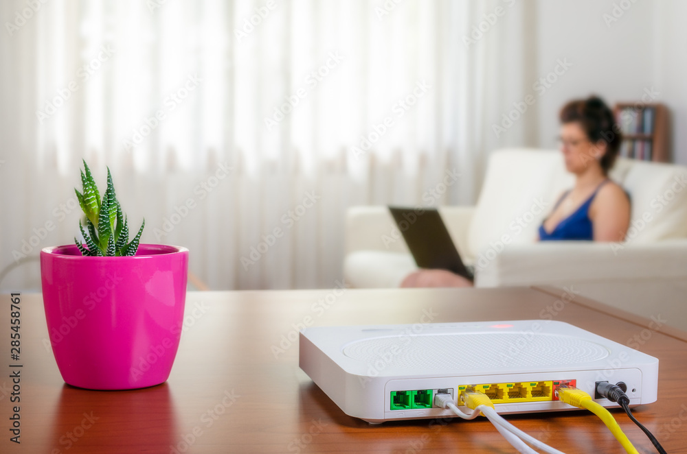 Modem router on a table in a living room. A woman using a laptop while sitting on the sofa is in background.