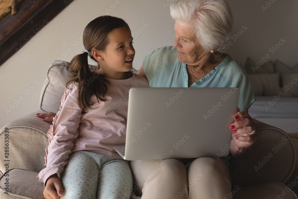 Grandmother and granddaughter discussing over laptop