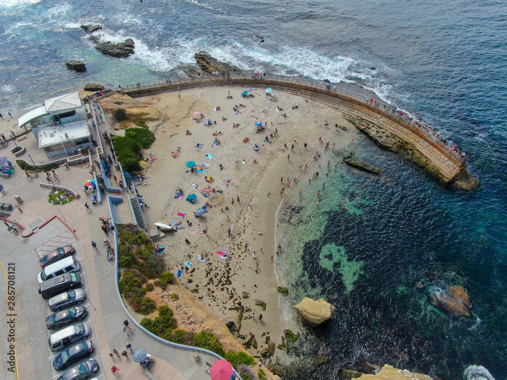 Beachgoers enjoying a beautiful sunny afternoon at La Jolla Cove in San Diego, CA. USA. Famous tourist destination.