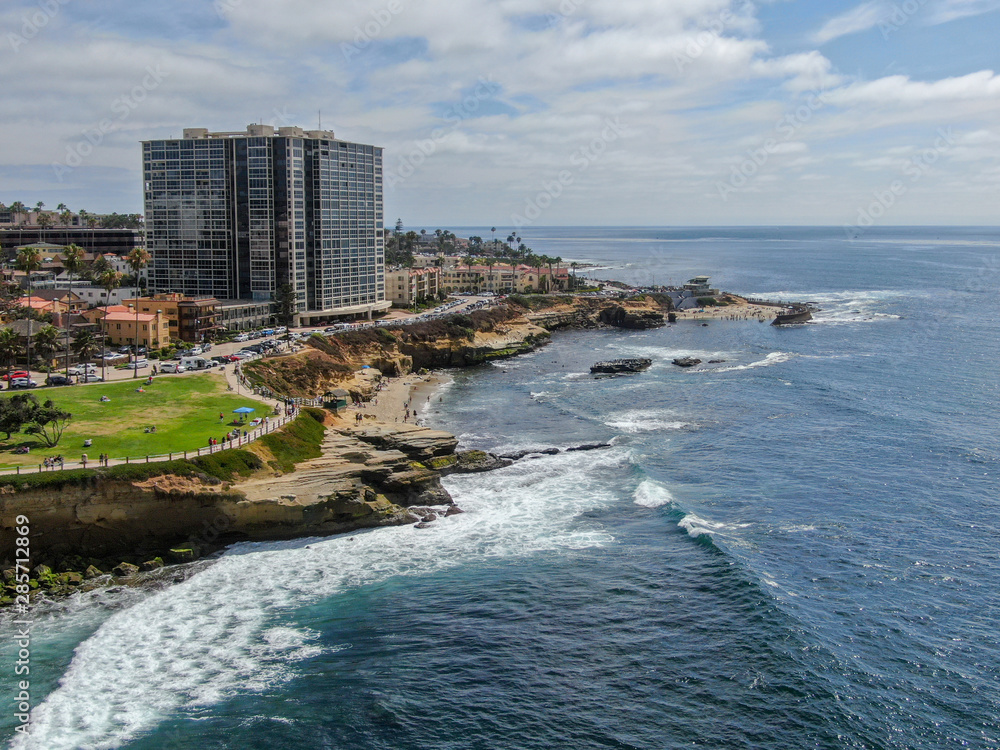 Aerial view of La Jolla Cove, small picturesque cove and beach surrounded by cliffs, San Diego, California. Protected marine reserve, popular with snorkelers and swimmers. Travel destination.