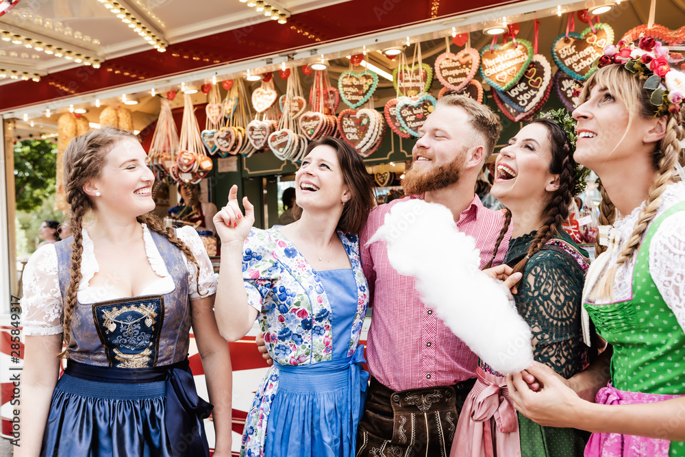 Freunde in Trachten Gruppe mit Dirndl und Lederhosen