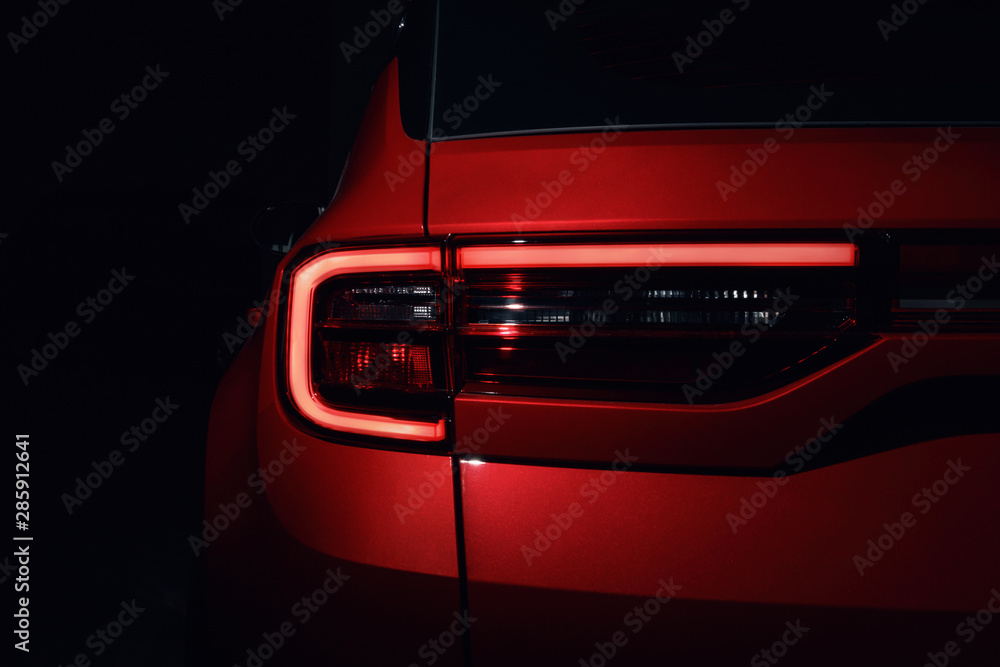 Detail on the rear light of a car. Car detail. Developed Car's rear brake light. The car is in the showroom