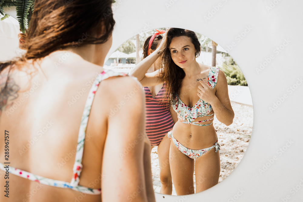 Slim beautiful girl in a swimsuits looks in the mirror on the open air on a sunny summer day