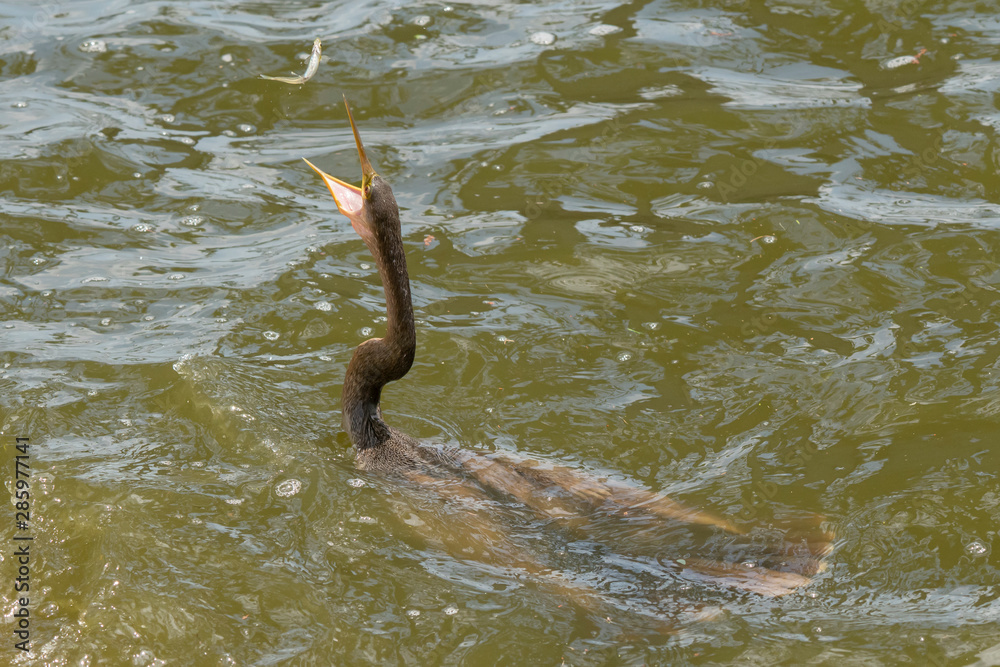 Young Anhinga (Anhinga anhinga) catches fish in Florida Lake
