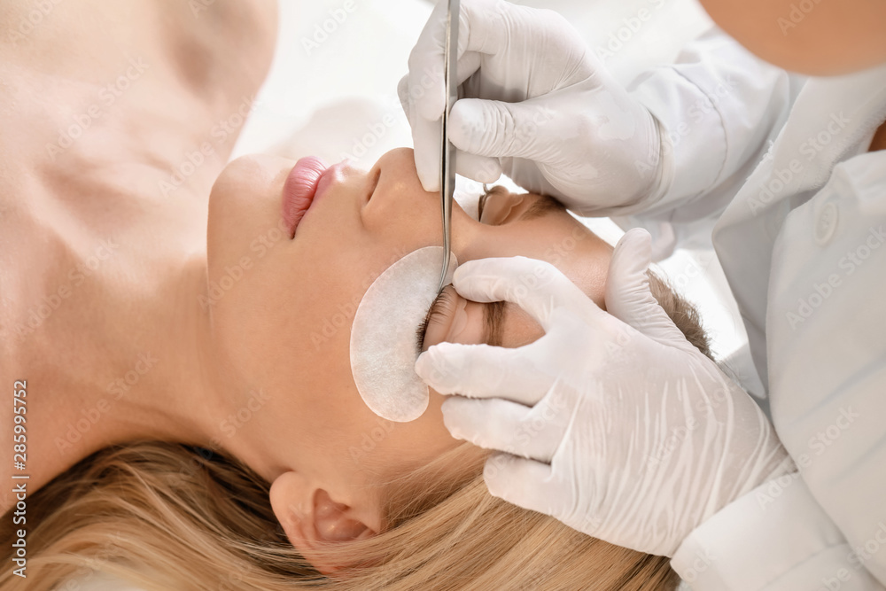 Young woman undergoing procedure of eyelashes lamination in beauty salon