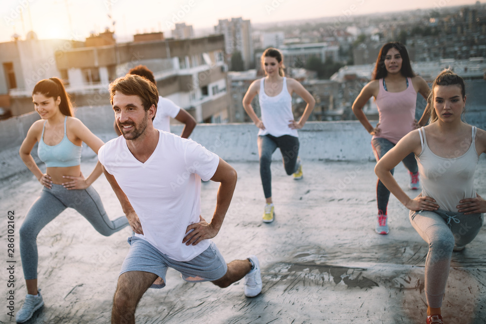 Group of fit healthy friends, people exercising together outdoor on rooftop