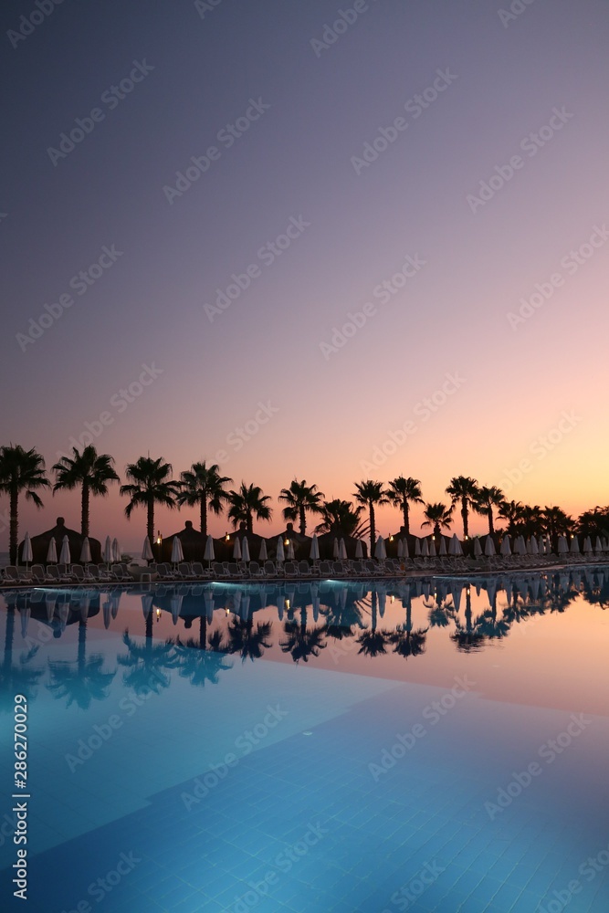 Tropical seashore with palms in the night with moonlight and clear sky.Antalya /Turkey