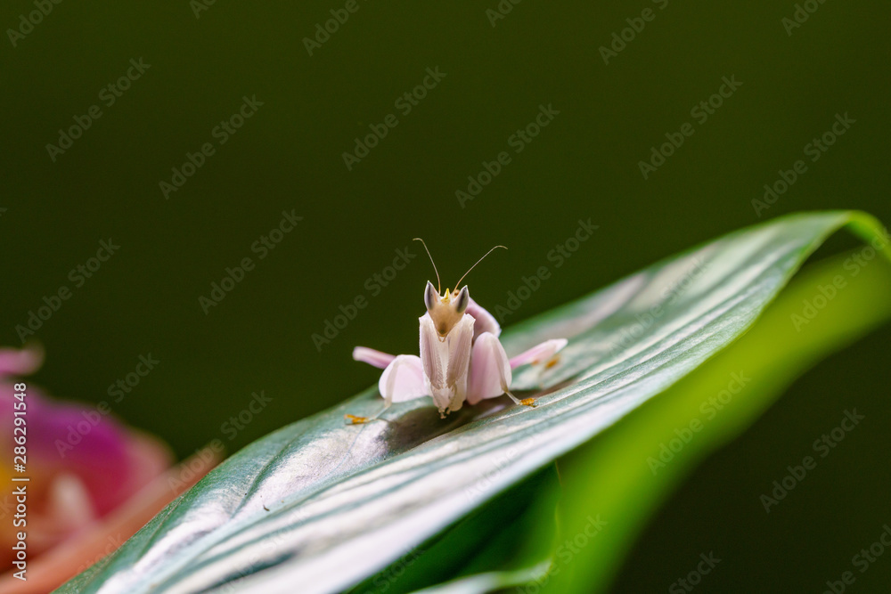 Pink Orchid Mantis (Hymenopus coronatus) on a leaf