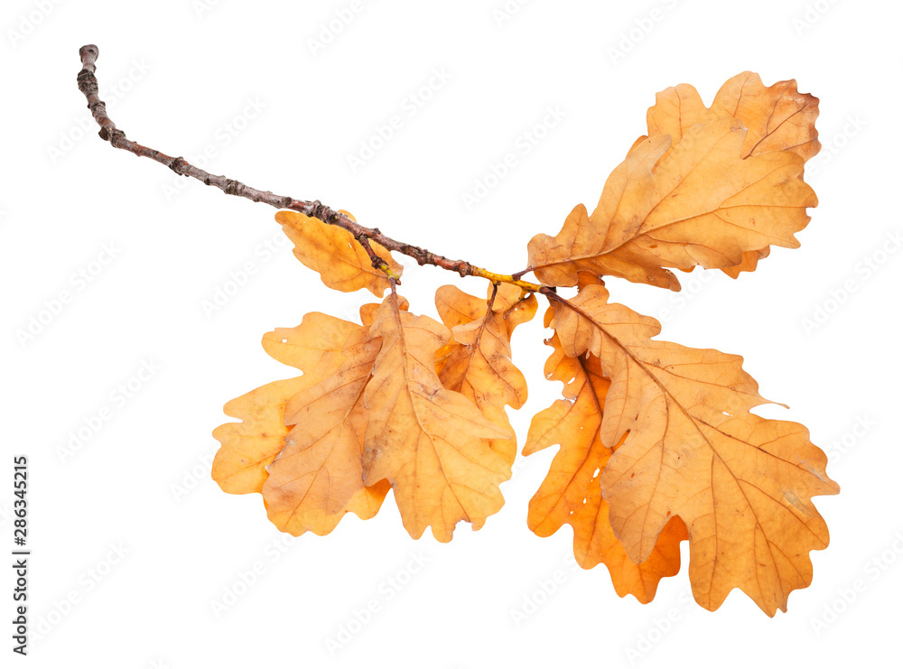 branch with brown oak leaves in autumn isolated