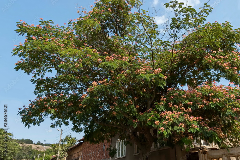 Albizia julibrissin Durazz or Persian, mimosa tree with beautiful flowers in Sredna gora mountain, Bulgaria