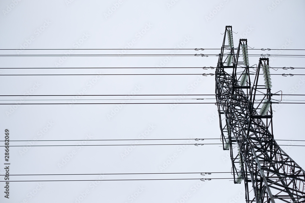 High voltage power line. View from the bottom up. Industrial infrasrtucture detail