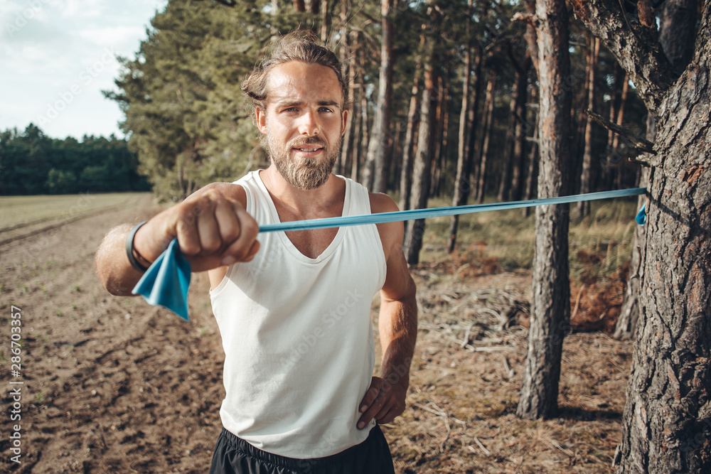 Junger Mann trainiert mit Gummiband in der Natur