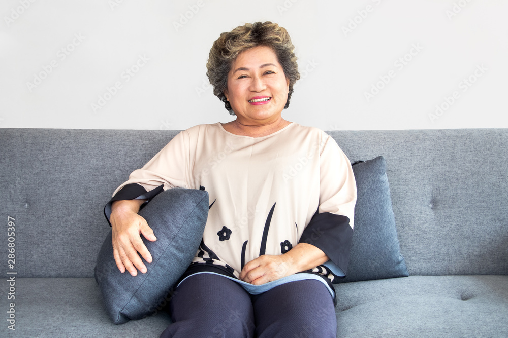 A happy asian senior woman sit on couch at home with smile and have make up on face. Concept of beautiful elderly woman, smiling and anti-aging.