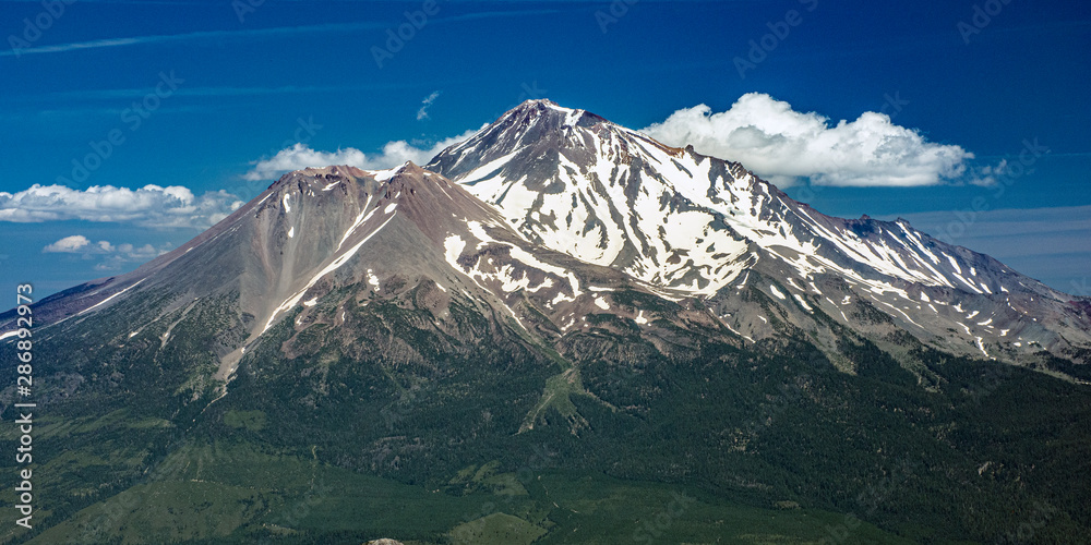 Mt. Shasta photographed on sunny summer day, snow-capped volcano one of Northern California’s tallest mountains